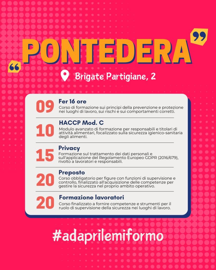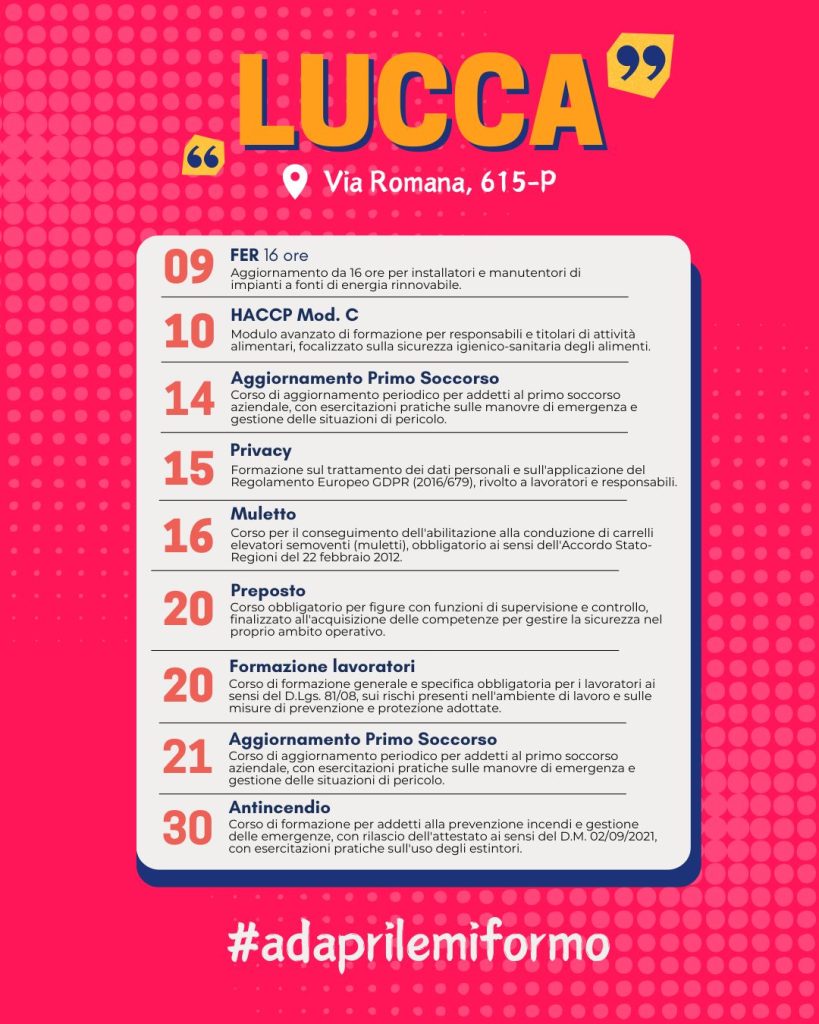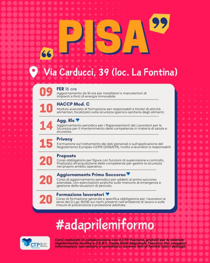 Ad aprile si aprono nuove opportunità formative dedicate a imprese, titolari, professionisti e lavoratori. I corsi in programmazione per il mese di aprile a Pisa, Lucca e Pontedera sono pensati per rispondere alle reali esigenze del mercato del lavoro, con percorsi mirati all’aggiornamento delle competenze, alla riqualificazione professionale e allo sviluppo delle soft skill.