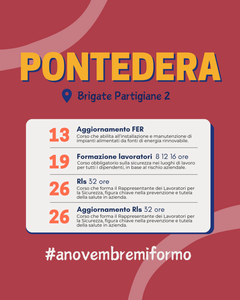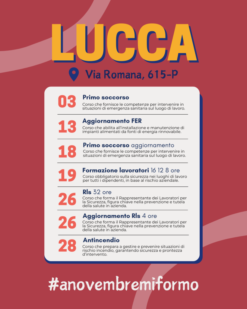 Per conoscere tutti i corsi in partenza a novembre, contattaci o visita la sezione “Corsi a catalogo” del sito. Siamo a disposizione per costruire insieme un percorso di crescita efficace e concreto.