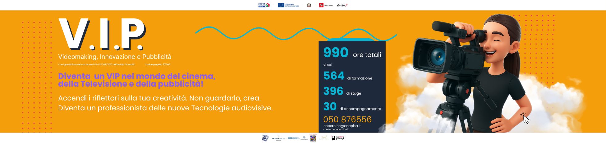 V.I.P. – Videomaking, Innovazione e Pubblicità, il nuovo corso gratuito IFTS promosso dall’Agenzia Formativa Copernico insieme a Pont-Tech, Liceo Artistico Russoli, Università di Pisa, Alkedo Produzioni e Fondazione ITS Prodigi. Un percorso completo che forma figure professionali pronte a operare nel mondo della comunicazione visiva, del marketing e della produzione multimediale.