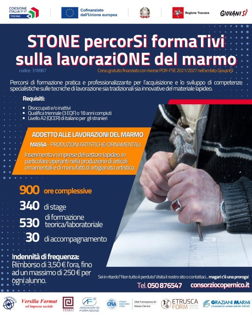Sei disoccupato o inattivo e vuoi costruirti un futuro solido in un settore di eccellenza? Con il corso gratuito STONE, addetto alla lavorazione del marmo, a Massa, hai l’opportunità di specializzarti nella lavorazione del marmo grazie a un percorso di formazione completo e professionalizzante, finanziato con risorse nell’ambito di GiovaniSì.