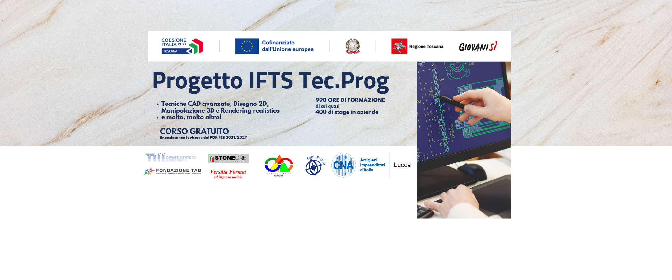 Il progetto prevede la realizzazione di un intervento formativo della durata di 990 ore, di cui 396 di stage e 30 di accompagnamento, rivolto a 20 soggetti. L’obiettivo del percorso è quello di offrire una formazione finalizzata all’accesso al mercato del lavoro attraverso l’acquisizione unitaria di competenze tecnico professionali riguardanti la specializzazione tecnica IFTS “Tecnico del disegno di prodotti industriali attraverso l’utilizzo di tecnologie informatiche”.